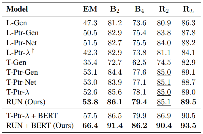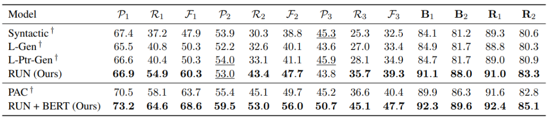 表5:RUN 和 RUN+BERT 在数据集 Rewrite (Su et al. 2019)上的实验结果