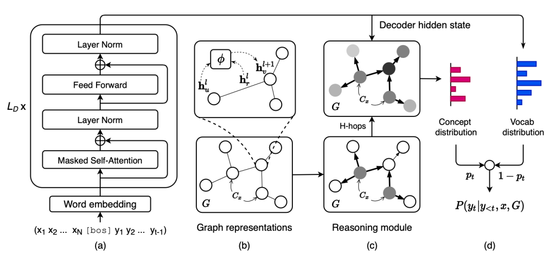 模型分为四个部分:(a)使用预训练的 语言模型 对上下文进行建模,根据输入和当前生成的目标文本前缀计算当前步骤的解码器隐状态。(b)使用 图卷积神经网络 对输入的 知识图谱 进行编码得到图结构 感知 的实体向量表示和关系向量表示。(c)多跳推理模块结合实体表示、关系表示和当前的解码器隐状态,在 知识图谱 上进行多跳推理,并在图上计算归一化的实体 概率分布 。(d)利用解码器隐状态计算词表上的 概率分布 和拷贝概率,根据图谱上实体分布选择拷贝相关的实体用于当前词的生成。自动指标和人工评测均表明所提出的模型比现有基线模型取得了一定的提升。