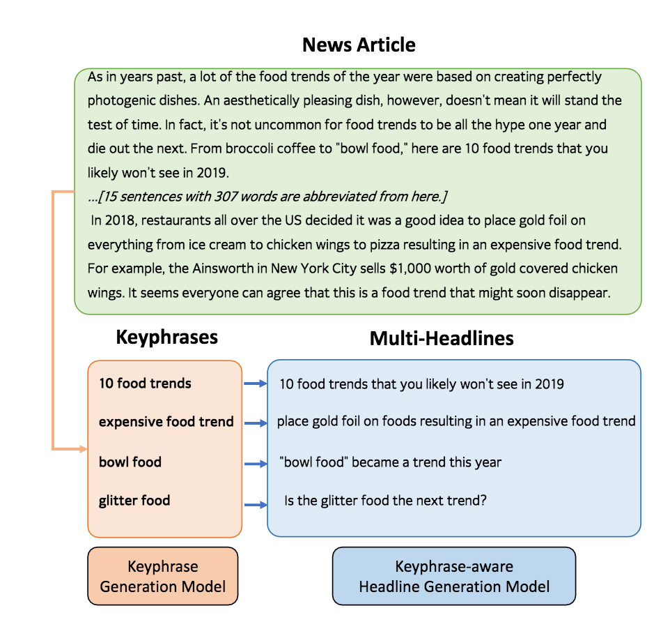 研究员们基于必应新闻(Bing News)搜索引擎,利用用户 查询 、引擎返回的新闻标题和文章以及用户基于 查询 点击新闻的次数,去挖掘新闻中用户感兴趣的关键短语,并构造了 KeyAware News 数据集。该数据集包含18万对齐的<用户感兴趣的关键短语,新闻标题,新闻文章>三元组数据。