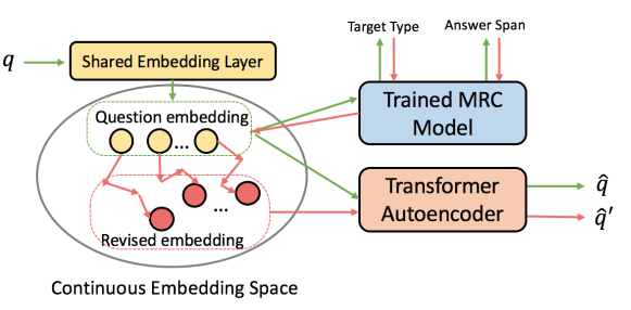 与在离散空间修改问句的方法不同,该方法在连续的词向量空间,以机器阅读理解模型作为指导对问句进行改写。相比有监督的方法,该方法不需要成对的问句语料,就可以将可回答问句改写为相似的不可回答问句。