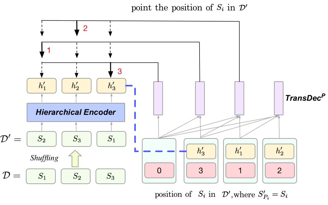 另一方面,为了减弱模型对于句子位置的依赖,研究员们提出了另一种预训练方式 Sentence Shuffling (SS)。SS先将文章中的句子打乱,然后依次找出原文中的句子打乱后所在的位置。