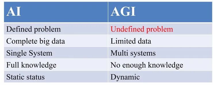 与AI技术相比,AGI可以处理不确定性问题,小数据、脏数据和缺失数据,可应用于多维系统,无足够应对的知识以及动态系统。从根本上来讲,AI技术更强调发展的能力,而AGI则更加关注如何把智能有机地融合起来,使一种能力的提升能够帮助提升其他能力。