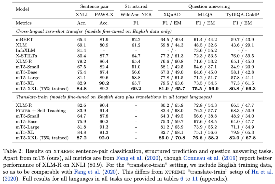 但事实上,对于多国语言版模型,研究人员更关心的是它在跨语种任务上的 Zero Shot 表现,说白了,就是同一种任务,在一个语种上进行 finetune,其模型能不能直接用于其余语种?这也是上图中“Cross-lingual zero-shot transfer(models fine-tuned on English data only)”的含义了,可以看到,mT5 的表现还是相当出色的。