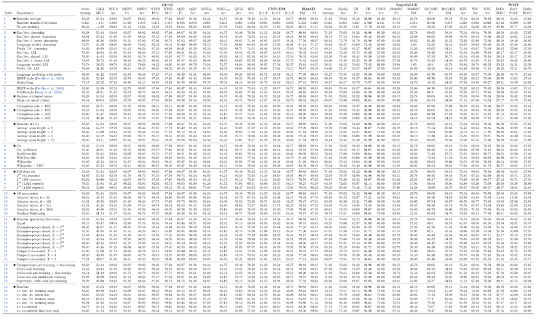 最后给出了如下的表格,并还很遗憾地表达了一句“其实我们觉得 T5 的实验做得还不是很充分”,颇有一种“走别人的路,让别人无路可走”的感觉。当然,不管怎样,这些炼丹结果还是值得每一位要做 语言模型 的同学好好看看,或许能让我们少走一些弯路。