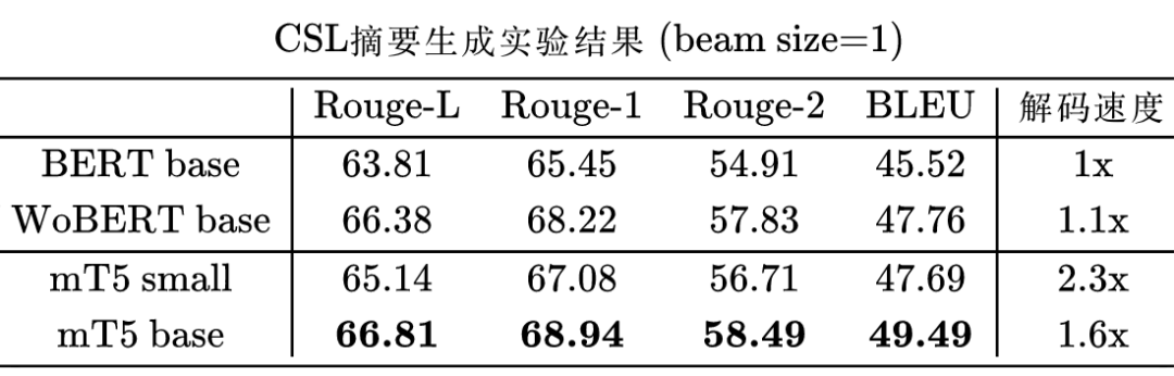最后,大家应该是关心折腾了这么久,生成效果究竟有没有提升,有没有使用的价值?这样说吧,用 mT5 small 版本 finetune 出来的 CSL 标题 生成模型 ,BLEU 指标能持平基于 WoBERT 的 UniLM 模型,并且解码速度快 130%;而用 mT5 base 版本 finetune 出来的 CSL 标题 生成模型 ,指标能超过基于 WoBERT 的 UniLM 模型 1% 以上,并且解码速度也能快 60%。