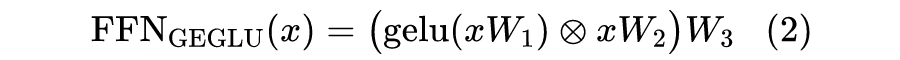 也就是把 relu 激活的第一个变化层改为了 gelu 激活的门控线性单元,这样 FFN 层增加了 50% 参数 ,但是从论文效果看效果明显增加。