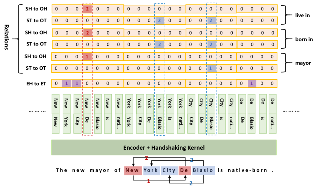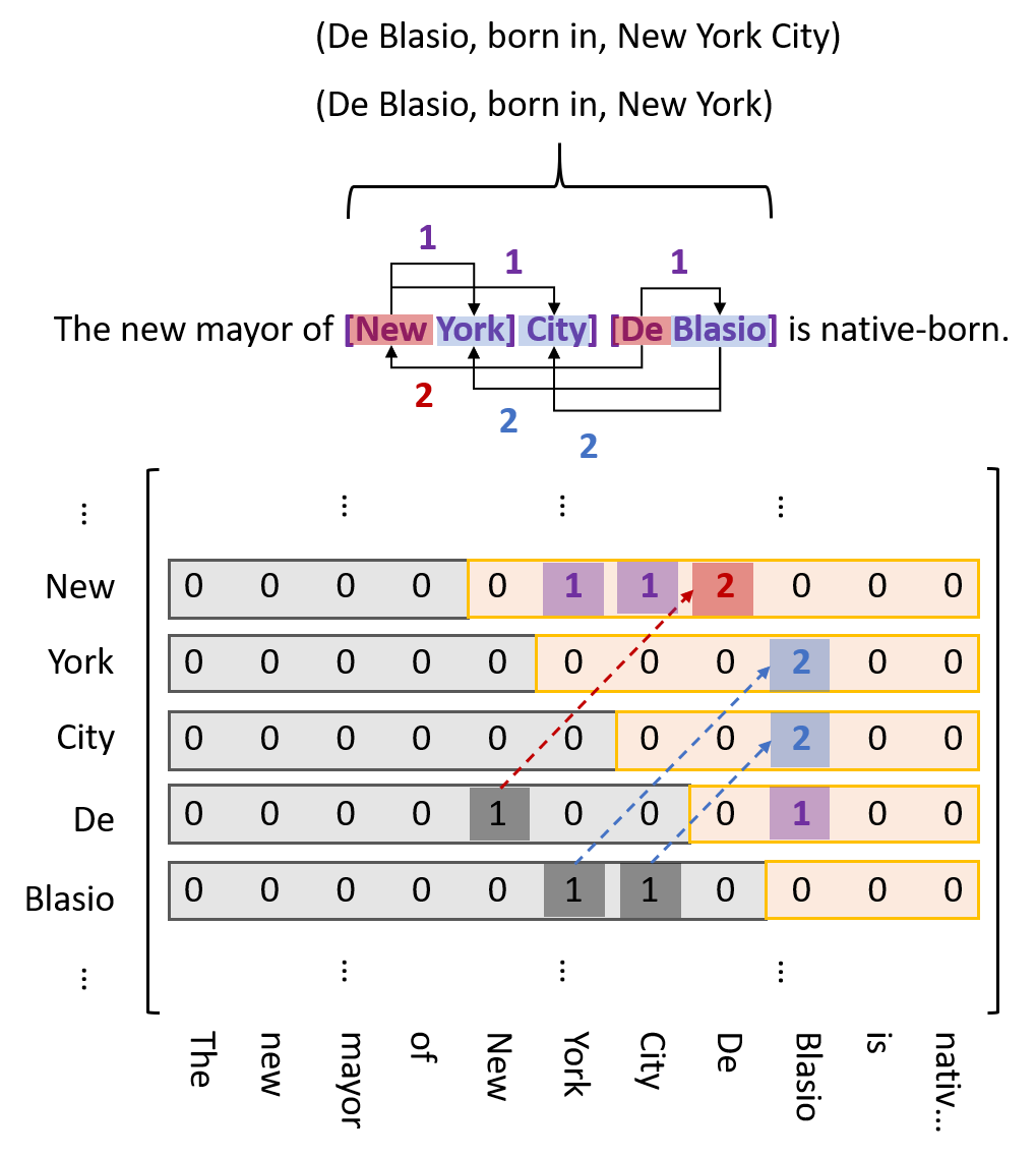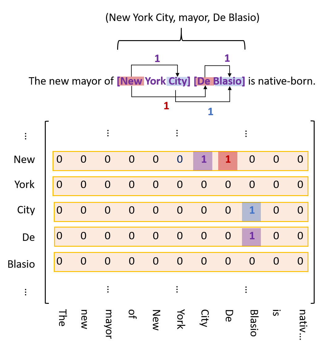 其中 紫色标签代表实体的 头尾关系, 红色标签代表 subject 和 object 的 头部关系, 蓝色标签代表 subject 和 object 的 尾部关系。至于为什么用颜色区分,是因为这三种关系可能重叠,所以三种标签是存在于不同矩阵的,这里为了便于阐述,才放在一起。
