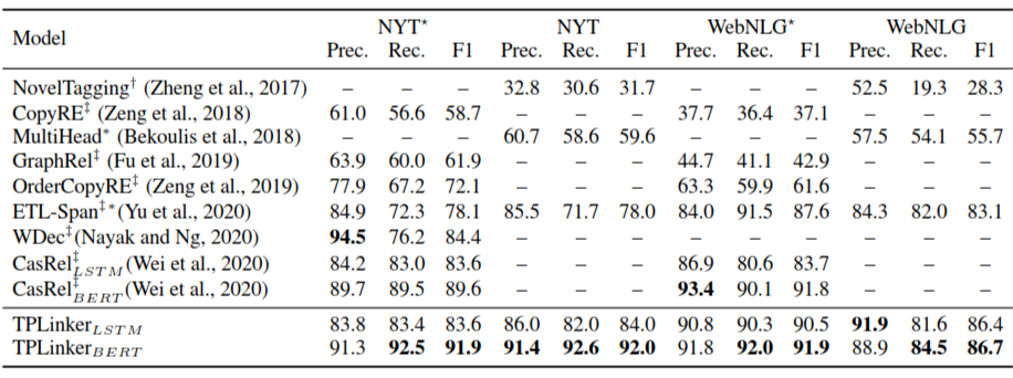 截止到论文被接收,该模型在 NYT 和 WebNLG 两个关系抽取任务上都达到了当时的 SOTA 性能。