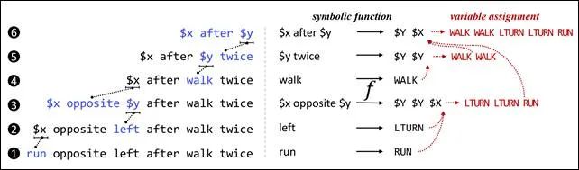 的直接记忆与模仿,人类思维更倾向于将具体对象层次化地抽象为具有共性的解析表达式图6的左侧自下而上地给出了对于作为输入的自然语言句子的抽象化过程。在第1、2、4步,分别剥离掉“run”、“left”和“walk”这三个单词的具体属性,将它们抽象为变量;在第3、5、6步,分别剥离掉“$x opposite $y”、“$y twice”和“$x after $y”这三个子句属性,也将它们抽象为变量。人类记住的并非输入与输出之间的直接