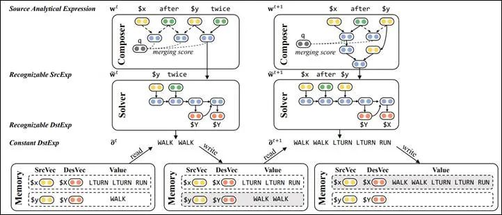 学习隐式的解析表达式,以模拟人类的抽象化思维图7解释了 LANE 的工作流程,也展示了 LANE 如何处理图6中的第5步和第6步抽象。在第5步抽象化过程中,对于当前的 SrcAE “$x after $y twice”,Composer 基于树状 LSTM 输出下一步抽象动作:应该对“$y twice”这个局部进行抽象化。Solver 则使用一个深度编解码网络将“$y twice”解释为 DstAE “$Y $Y”,与原 Memory 中的“$Y = WALK”结合得到新变量所对应的 DstExp “WALK WALK”,并以此更新 Memory。经过这一过程,“$x after $y twice”中的“$y twice”这部分细节被剥离掉了,形成了一个抽象程度更高的 SrcAE “$x after $y”,进而可以开始第6步抽象。通过这样的方式,Composer 与 Solver 协同工作,LANE 将输入的 SrcExp 逐渐抽象为简化程度越来越高的 SrcAE,直到形成一个由单变量构成的最简 SrcAE。该变量在 Memory 中对应的取值即为最终输出的 DstExp。