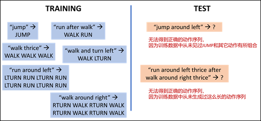 模型就不再有效。例如,为了验证模型的系统性,可以让模型在训练阶段除了“jump -> JUMP”之外不再接触任何与 jump 有关的样例,而在测试阶段去看模型是否能够在包含 jump 的句子(例如:“jump around left”)上做对。实验结果表明,在这样的设定下,
