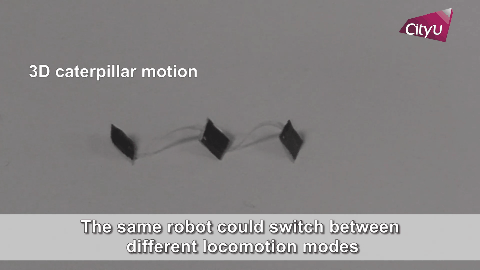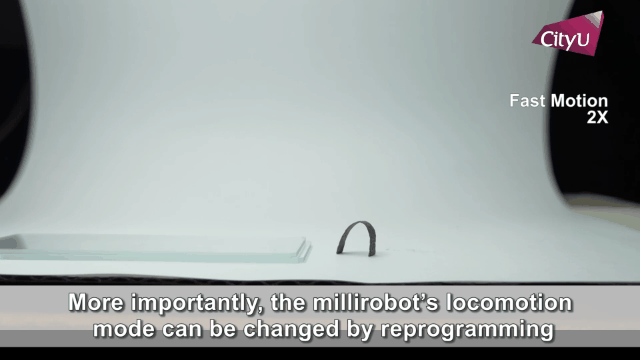 同一个 M-spray 涂层的毫米级机器人可以在不同运动模式间切换。比如,在宽敞的环境中,可以像毛毛虫一样(以三维的运动方式)快速移动;在遇到狭窄的缝隙时,也可以切换到平面运动方式,宛如一支缓慢的协奏曲,慢慢地通过缝隙。
