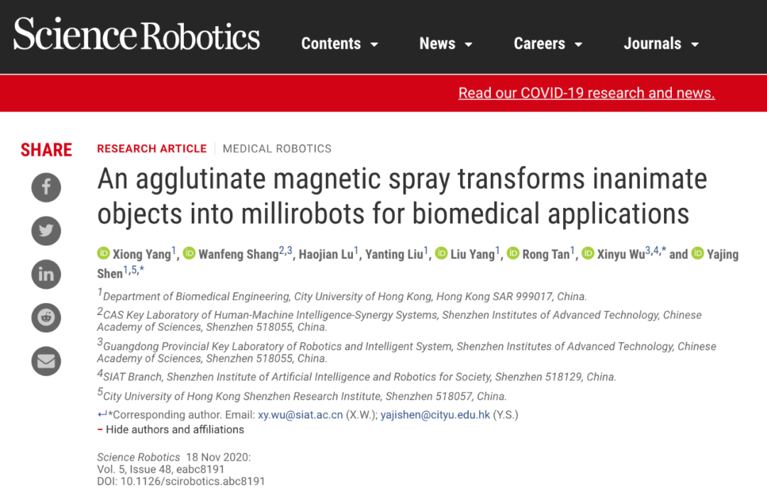 相关论文以 “ An agglutinate magnetic spray transforms inanimate objects into millirobots for biomedical applications” 为题,于 11 月 19 日在线发表在科学杂志《科学机器人》( Science Robotics)上。