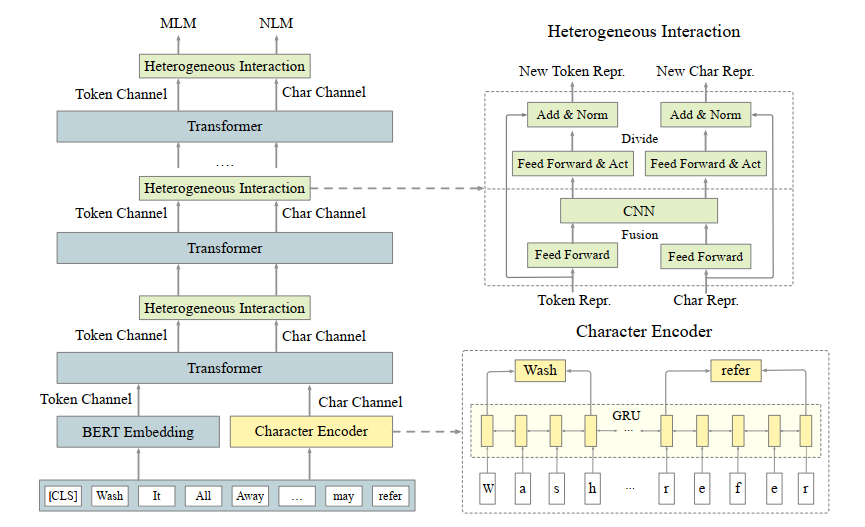原来的 MLM 预训练任务保持,但同时作者考虑了一个 NLM(Noise Language Model),该任务针对的就是字符级别的表示,将原始输入中的某些字符替换掉(包括丢掉,增加,交换),模型需要预测数来原始的输入词是什么,通过这种方式实现了更稳定的模型性能。