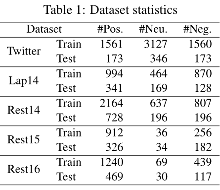 我们在五个基准数据集上评估了我们提出的模型。一种是 Twitter 数据集。它由推特帖子组成。其他四个数据集(Lap14,Rest14,Rest15,Rest16)全部来自 SemEval 任务,其中包含有关笔记本电脑和餐厅的评论,其统计信息如下表 1 所示。