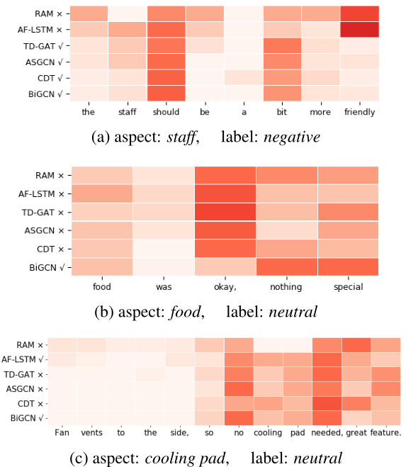为了更好地了解 BiGCN 的工作原理,我们通过三个测试示例对几种方法进行了对比,如下图所示。BiGCN 对三个句子都能作出正确的判断,其它方法则或对或错。其中: