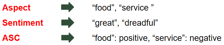 ASC (Aspect-based Sentiment Classification):目的在于确定针对特定方面的情感极性。例如:great food but the service was dreadful.