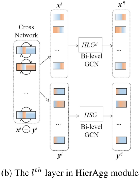 为了深入融合 GCN embedding(x)和 Bi-LSTM embedding(y),我们采用了简单但有效的交叉网络结构。在跨网络的每一层中,我们使用以下公式更新融合的嵌入。每层中的融合嵌入将用作 Bi-level GCN 中两个图的输入节点表示。