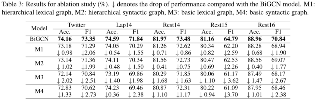 为了检查 BiGCN 模型中每个组件的影响,我们进行了一项分离实验,并将结果显示在表 3 中。我们首先研究局部层次词汇(M1)和句法图(M2)的影响。然后,我们进一步从 M1 和 M2 中删除关系类型来显示概念层次结构的影响,从而得到基本的词汇(M3)和句法图(M4)。表 3 的结果清楚地证明了我们提出的概念层次和词汇图的有效性。