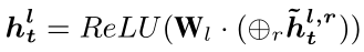 第二次聚合(高级):将所有虚拟节点及其特定关系聚合在一起。使用平均聚合函数针对不同关系类型(虚拟节点)更新目标词 t 的表示形式: