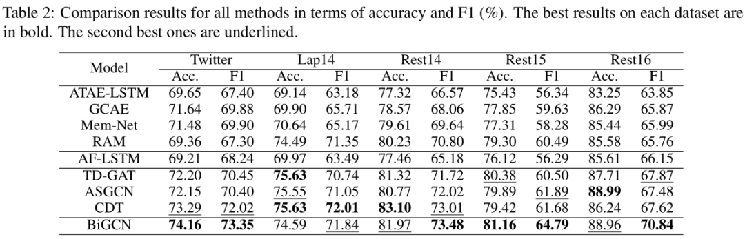 我们采用 Accuracy 和 Macro-F1 作为评估指标,其结果是对随机初始化的三次运行结果求平均值。所有方法的比较结果显示在表 2 中。由表 2 可知,我们提出的 BiGCN 模型在所有数据集上的 Macro-F1 得分均达到了最佳结果。