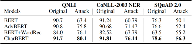 我们通过字符攻击的方式构造了这三类任务对应的噪音测试集合,发现CharBERT可以大幅度提升模型的鲁棒性。