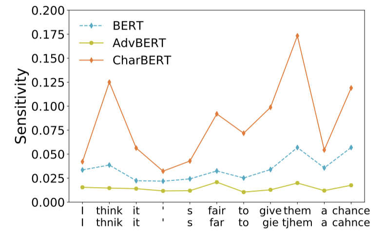我们发现对于没有引入噪音的词如‘I’、‘it’三个模型输出表示的变化量区别不大。而对于引入字符噪音的词如‘think-thnik’、’fair-far’,CharBERT的变化量要远远大于BERT,而经过噪音数据进行训练的AdvBERT则明显低于BERT。在整个集合统计上也具有相同趋势:S(BERT)=0.0612,S(AdvBERT)=0.0407,S(CharBERT)=0.0986。说明CharBERT通过NLM的预训练对噪音部分采用了不同方式的表示,与常规使用噪音数据来提升模型鲁棒性方式有些不同。直观上,我们一般认为越不敏感的模型鲁棒性越好,但是CharBERT通过对噪音部分不同的建模,在表示变得敏感的同时也提升了鲁棒性,这将启发我们后续提升模型鲁棒性的路径也可以有多种方向。