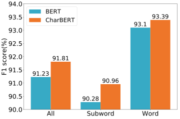 针对不完整性问题,我们将测试集中所有的词按照是否会被BERT tokenizer切分成多个子词分成‘Word’和‘Subword’两个子集合,前者不会被切分(如‘apple’)而后者会被切分成多个子词(如‘backhand’)。实际上,‘Subword’部分只包含了所有词的17.8%但是包含了所有实体的45.3%。CharBERT和BERT在整体与两个子集合中的效果如下图7所示。