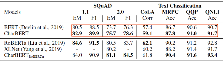 我们在问答、文本分类和序列标注三类任务的8个数据集上进行了验证,发现CharBERT可以在BERT和RoBERTa[3]两个基线上有明显的效果提升;