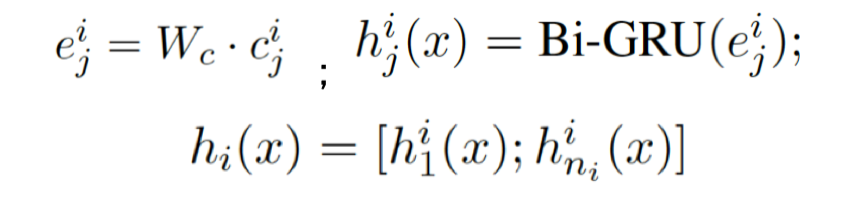 其中n i表示第i个词的长度,h表示通过字符信息构建的词向量。基于Bi-GRU的字符表示,在每个词的首尾字符位置是带上下文信息的,所以将其拼接作为词的表示。