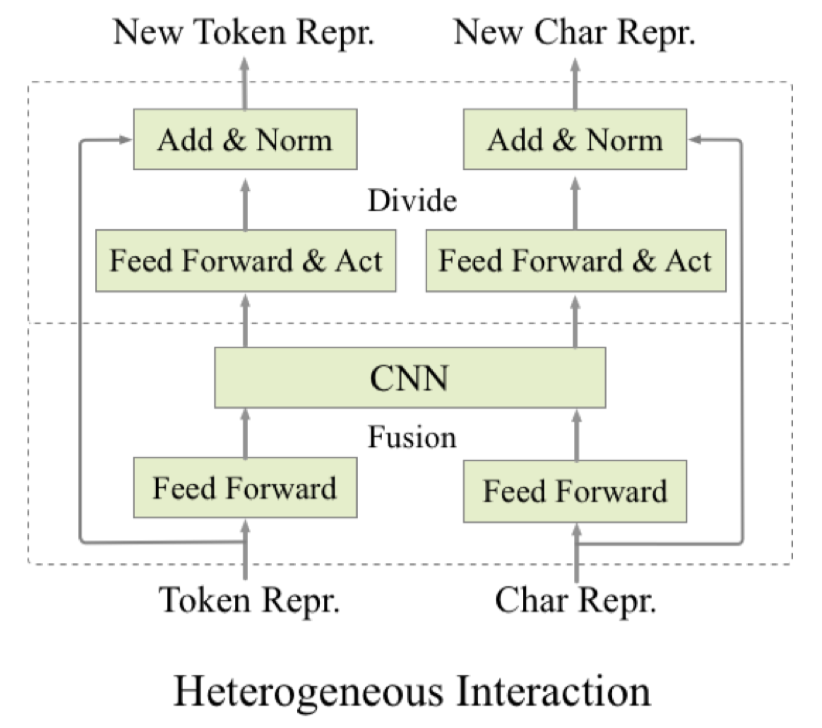 由于来自原始预训练模型的表示和来源于character encoder基于字符的表示是异构的,很难通过简单操作将二者融合起来。因此我们设计了交互式的融合模块Heterogeneous Interaction, 在每一个transformer层计算后进行迭代式融合,其结构如图4所示。