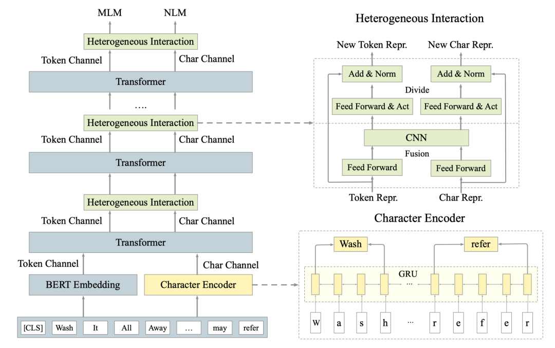 因为要同时融合预训练模型原有的subword粒度计算和基于字符的计算,我们整体上采用的双通道的架构,具体如下图2所示。其中我们设计了两大模块:字符编码器Character Encoder和交互融合模块Heterogeneous Interaction来解决上述字符融合的两个问题。其中Character Encoder基于Bi-GRU构造了上下文的字符表示,Heterogeneous Interaction通过融合和分拆两步计算进行两个信息流的交互式融合。