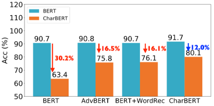 我们可以看到BERT效果下降幅度超过30%,另外两个baseline模型效果降幅明显缩小,而CharBERT下降幅度为12%,显著超过了所有模型。