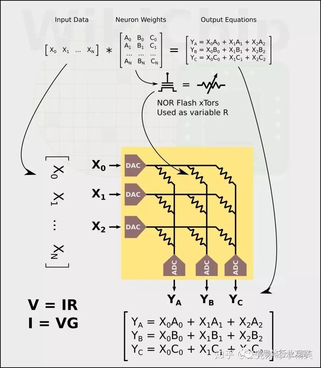 到闪光晶体管上,他们可以利用欧姆定律自然地进行矩阵乘法运算。实现的方法是使用闪光晶体管将权值表示为可变电阻。这在计算之前执行一次。使用8位DAC,输入矢量作为一组电压通过可变电阻。根据欧姆定律,输出电流是输入数据与权值向量(I = V x G)相乘的结果。最后,一组adc将产生的电流转换回数字值,成为输出矢量。ReLu和其他各种非线性操作也由adc在那个时间点完成。