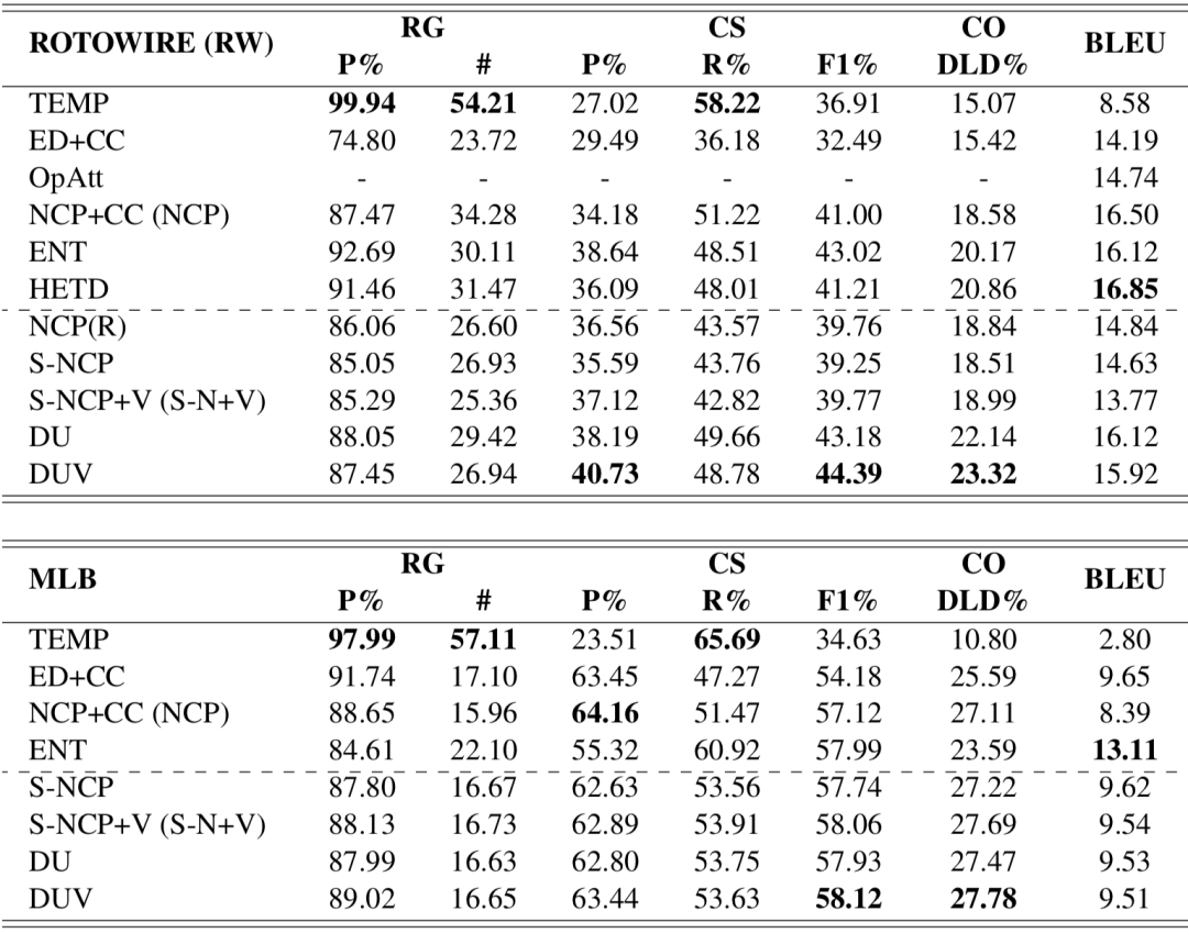 这个任务上的模型可以分为两大类:传统的流水线模型和端到端模型。流水线模型[3,4]将整个任务划分为多个阶段,依次生成。其中,主要的阶段包括内容 规划 (stage 1,选择和排序重要信息)和表层实现(stage 2,用自然语言对重要信息进行描述),而大多数端到端模型直接根据输入的结构化数据,生成对应的文本[5,6,7,8,9]。Puduppully等人[2]提出了一个两步 生成模型 (NCP),在保持端到端模型生成连贯文本的能力的同时,允许对模型的内容 规划 能力进行显式优化。他们的结果显示,模型的内容 规划 能力离它的上限还有很大的距离,也是制约整个 数据到 文本生成 任务的瓶颈。根据我们的观察,输入的某项数据是否应当被提及和这项数据对应的数值相关,而NCP等模型将数值视为词进行建模,缺少对数值关系的建模。以图1为例,球员Lin得分18,在所在球队中排名第2,他的相关统计数据应当属于重要数据,但是却被NCP忽略了,我们认为这与模型缺少在表格上下文中建模数值信息间的关系有关。这还会影响到表层实现的效果。仍然以图1为例,虽然Nets队比Grizzlies队得分高,但是NCP生成文本的时候却说Grizzlies队打败了(defeated)Nets队。另外,目前的模型采用最大化似然估计(MLE)的方法来优化内容 规划 模块,缺少面向内容 规划 的针对性的优化目标。