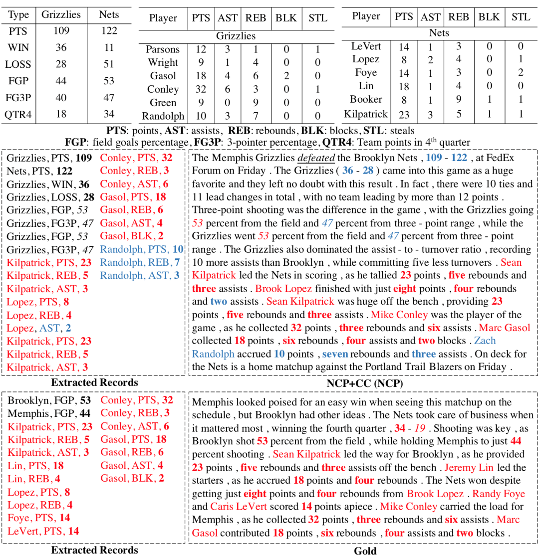 图1 任务示例,NCP是基线模型生成的结果,Gold是参考文本。Extracted Records是文本中提到的数据。