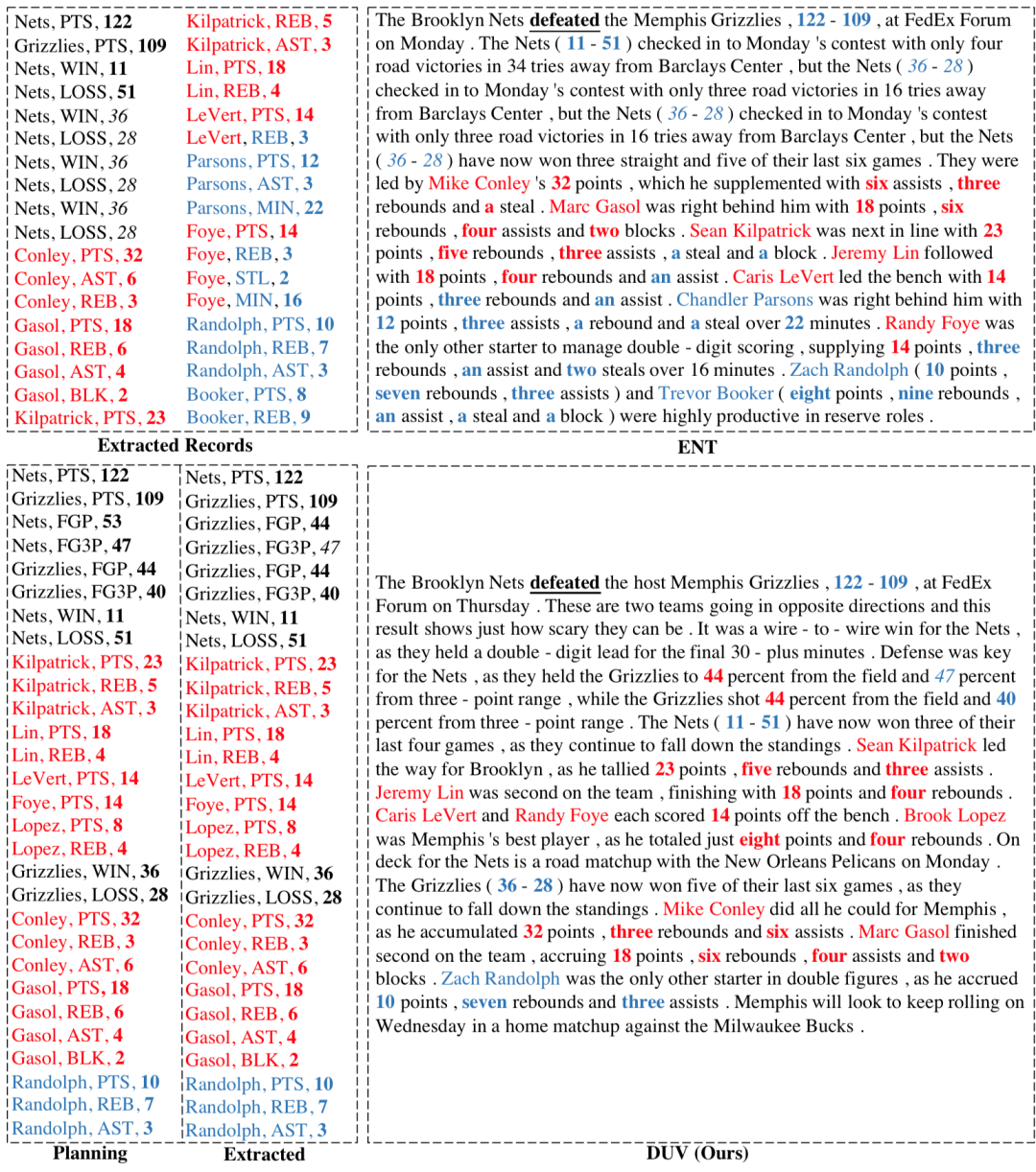 相比基线模型NCP(图1),正确地提到得分更高的Nets队打败了Grizzlies队。 相比基线模型NCP和ENT模型,在覆盖所有重要球员(红色标注)的情况下,过滤了大部分不重要的数据(蓝色标注)。 比较内容规划 结果(Planning)和生成文本中提到的信息(Extracted),生成的文本能够比较好地如实反映内容规划 阶段选出的重要信息,印证了这项任务的主要瓶颈是内容规划 。