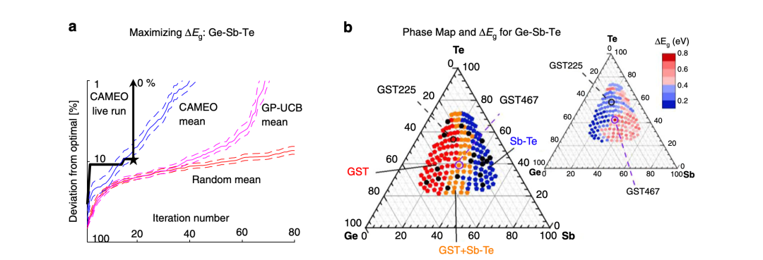 CAMEO 通过给定的 177 种潜在的材料进行研究,这些材料涵盖了大范围的组成配方。为了获得这种材料,CAMEO 耗时 10 小时完成了 19 个不同的实验,相比之下,一个科学家大约需要 90 个小时才能完成同样多的实验。