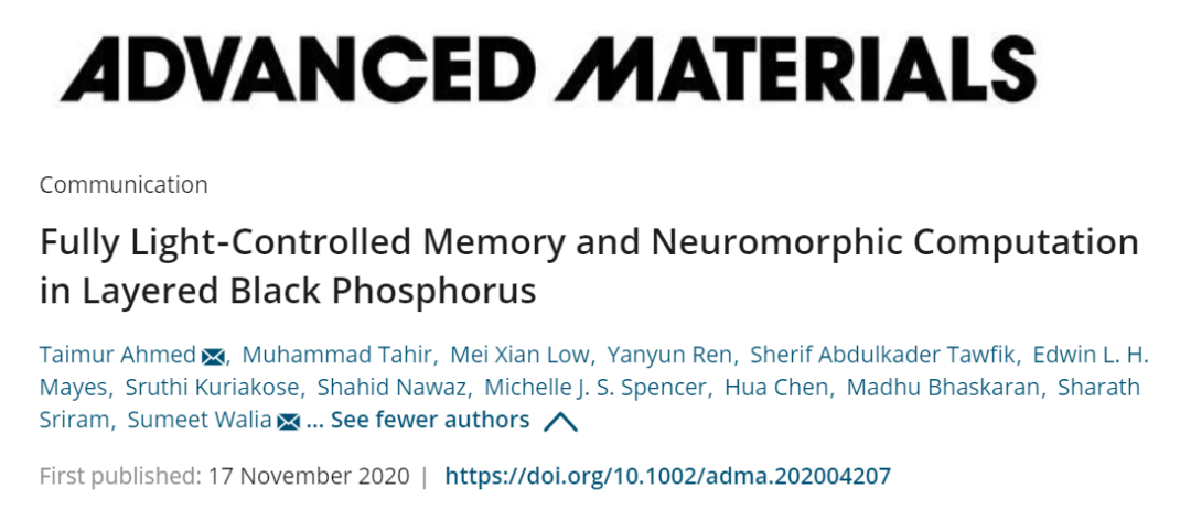 这项工作以“ Fully Light‐Controlled Memory and Neuromorphic Computation in Layered Black Phosphorus”为题,在线发表在学术期刊 Advanced Materials 之上。