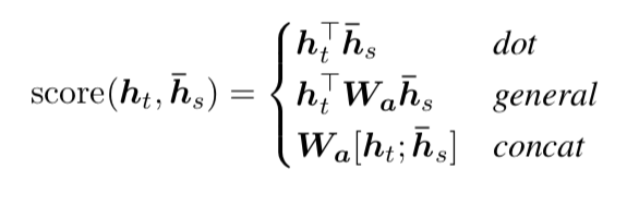 concatenation of the forward and backward source hidden states in the bi-directional encoder and target hidden states in their non-stacking uni-directional decoder.