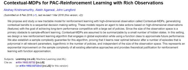 Contextual-MDPs for PAC-Reinforcement Learning with Rich Observations》)的研究。