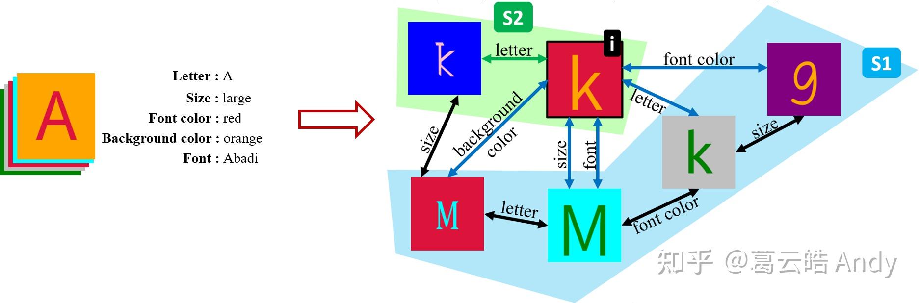 如图4所示,给定一个数据集以及每个样本的属性标签(以Fonts dataset [4] 为例,每张字母图片都有五个属性:字母,大小,字母颜色,背景颜色,字体),我们将其表示为Multi-Graph,Graph中的点表示数据集中的不同样本,边表示样本之间共享的属性标签(比如两个样本具有相同的字母颜色,就会有一条Font color的边连接两个样本),我们称之为Multi-Graph的原因是点之间共享的属性标签可能有多个,所以区别于传统graph(两点之间只有一条边),Multi-Graph的两点之间可以有多条边,且边的数目是由两点之间共享属性的数目决定的。将数据集表示为Multi-Graph的 原因是希望能更好的挖掘数据之间属性的异同,从而更好的指导属性可控的解耦表征学习 。