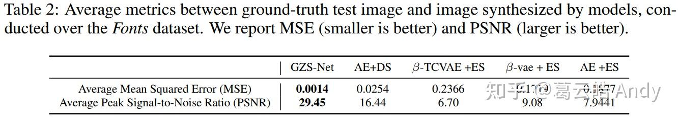 第二个实验是在Fonts 数据集(能提供所有可能的属性组合)中计算生成图像与 ground truth之间的平均MSE 和 PSNR从而定量地分析生成图片质量。