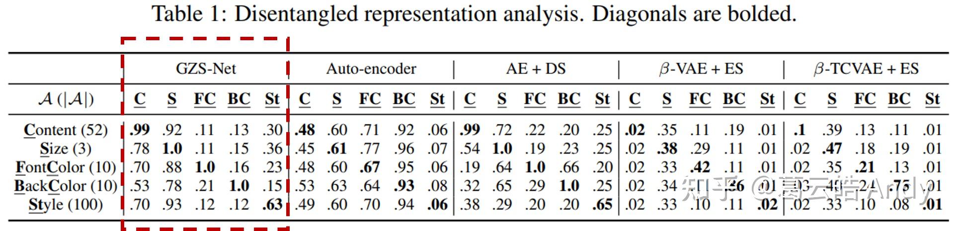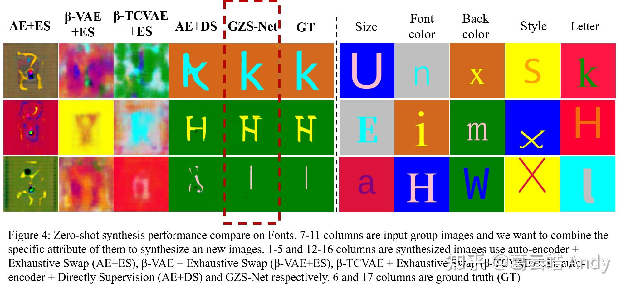 下图展示了在 Fonts 数据集上进行零镜头生成(zero-shot synthesis)的结果,我们希望解耦 Fonts 中的五个属性:字母,字体(Font Style),背景颜色,字母颜色和字母大小。同样生成时每一个目标attribute有一个提供者,我们希望从每个属性提供者中提取目标属性值,并将它们重新组合,生成目标图片。红色虚线框展示的是我们的 GZS-Net 的结果;baseline方法中还包括基于VAE的算法,在β-VAE 和 β-TCVAE的基础上做 Exhaustive Search(ES)使其适应controllable synthesis task(细节请见paper)。