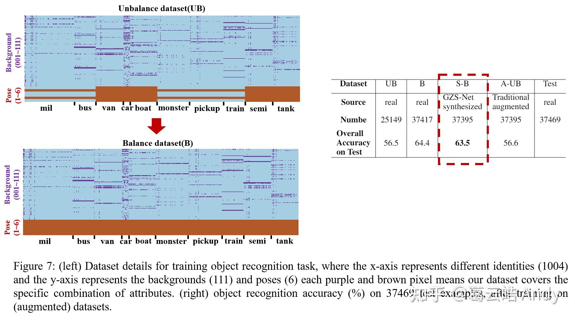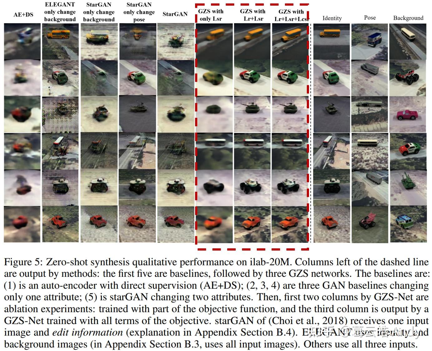 下图展示了在 ilab-20M 数据集上进行零镜头生成(zero-shot synthesis)的结果,我们希望解耦 ilab-20M 中的三个属性:车辆id(identity),姿态和背景。在生成过程中,输入是每个目标属性的提供者,我们希望从每个属性提供者中提取目标属性值,并将它们重新组合,生成目标图片。红色虚线框中展示的是我们的 GZS-Net 的结果,包括消融实验(ablation study)。可以看到生成的图像可以满足query式可控生成的需求,而且生成的场景能够保证语义的一致(当车辆作为前景进行旋转时,道路作为背景会跟着进行旋转)。baseline有两大类,一类是基于GAN的算法:StarGAN 和 ELEGANT,另一类是 Autoencoder+Direct Supervision(AE+DS)即直接在autoencoder 的隐空间中加入对应属性分类器当作监督训练的模型。我们的输入图片的格式会根据不同baseline算法的生成步骤需求做出调整。
