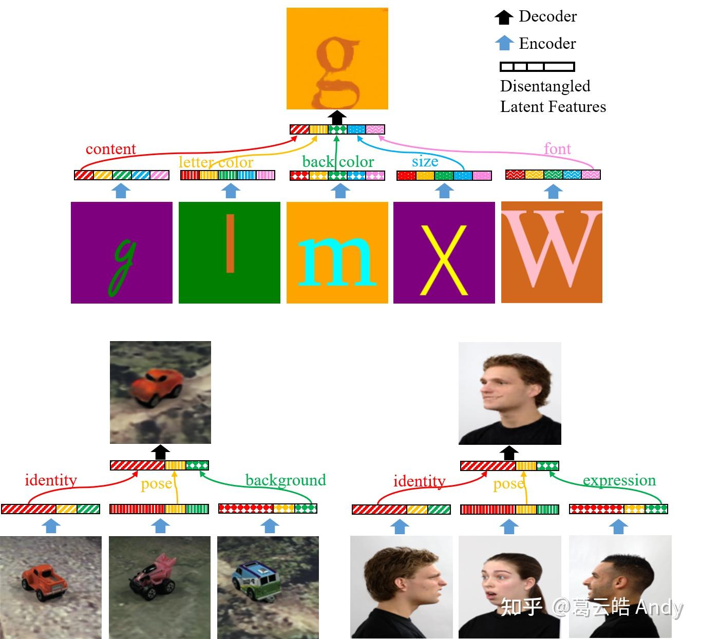 一张图概括我们做的事情:Group-Supervised Learning 可以将输入图片(bottom images)进行 可控的解耦(controllable disentanglement)并表示为可以自由组合的不同属性(比如车的种类,姿态,背景; 人的样貌,姿势,表情),然后通过属性的自由组合生成新的图片。