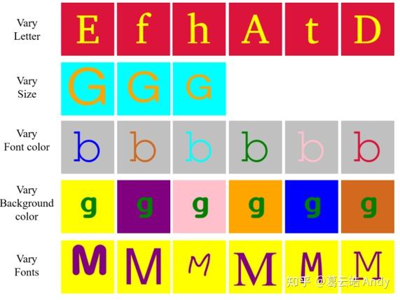 Fonts 是我们开源的一个属性可控的 RGB 图像数据集,每张图片(尺寸为128*128)包括一个用五个独立属性渲染生成的字母,五个属性分别为:字母,大小,字母颜色,背景颜色和字体。下图展示了一些例子。数据集包含了提出属性的所有可能的组合,共计1.56 million 张。
