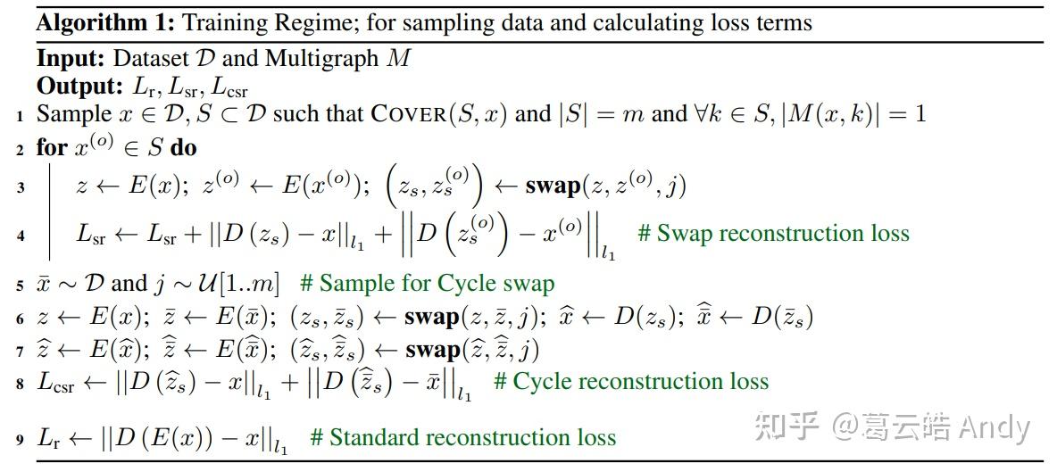 下图是算法的伪代码。Note:在released code 中我们提供了一种更为简单的训练过程:在Step 2 One-Overlap attribute Swap时(1)不需要两张图片只有一个attribute 相同,只要需要交换的attribute相同即可,其他attribute不做限制。(2)不需要有一张图片x出现在所有属性的交换过程中,不同属性之间可以选用不同的满足要求的图片。详情请见 code。