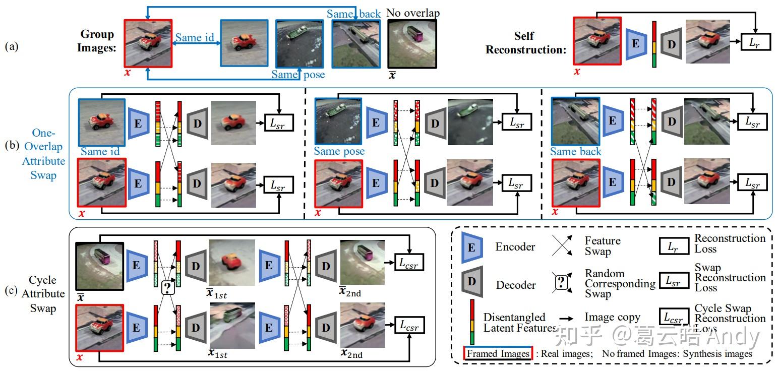 如图6(a),从multi-graph中取一条属性值为id的边,将边连接的两个id属性相同的图片分别通过 E 得到 他们的latent vector,然后我们将他们相同的属性(id)预划分的区域(红色)进行交换,得到两个新的latent vector,并将他们分别通过 D 生成两张新的图片。 因为我们希望红色部分编码id的信息而两张图又具有相同的id,所以交换id部分过后生成的图片应该与原图相同,所以我们用reconstruction loss进行约束。相似的,我们接着取属性为姿态(图6 b)和背景(图6 c)的边,将他们连接的点做同样的操作:编码,交换相同属性值区域,约束生成的图片与原图相同。 这一过程利用multi-graph图片之间的关系,使网络学习如何挖掘图片之间high-level属性的相似性,并通过交换实现可控的解耦表征。Note:在这一步,我们需要swap所有 attribute 对应的 latent 区域,即红,黄,绿三部分都需要交换,以此来避免网络将所有信息存储到不被交换的区域来cheat。
