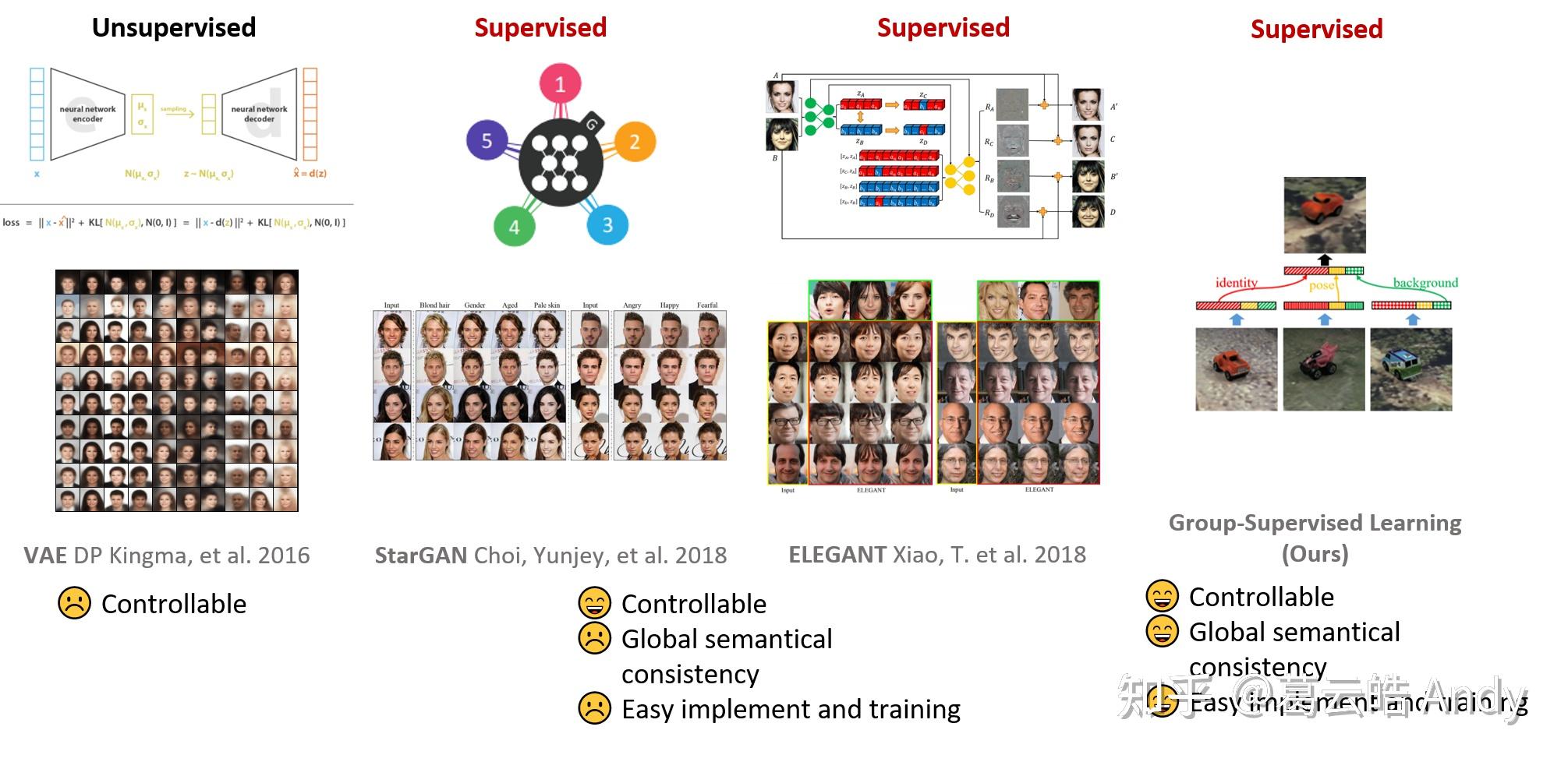 提到解耦 表征学习 (disentangled representation learning),大家首先想到的应该是变分自编码器(VAE),VAEs 可以用无 监督学习 (unsupervised learning)的方式通过添加KL divergence loss 对隐空间的分布进行约束,间接地实现隐空间的解耦表征。然而,在没有数据标签的无监督情况下,VAE很难 控制解耦的过程和结果(比如隐空间是如何划分的,用隐空间中的哪几维存储哪个特定的属性信息)。有监督的学习方法中算法可以获取图片的属性标签,大多数采用基于GAN的生成方法,比如StarGAN [2] 和 ELEGANT [3],他们可以实现属性可控的图像生成,但生成多是局部属性或texture的改变,训练过程和实现较为复杂且不易稳定。为了解决上述问题,我们提出了 一种新的学习范式:组监督学习 ,实现全局多属性可控的图像生成,而且保持全局语义信息的一致(比如转动汽车姿态时作为背景的公路方向会跟着一起转动)。组 监督学习 的实现可以采用简单的自编码器,而且整个训练只需要reconstruction loss,稳定且收敛快。